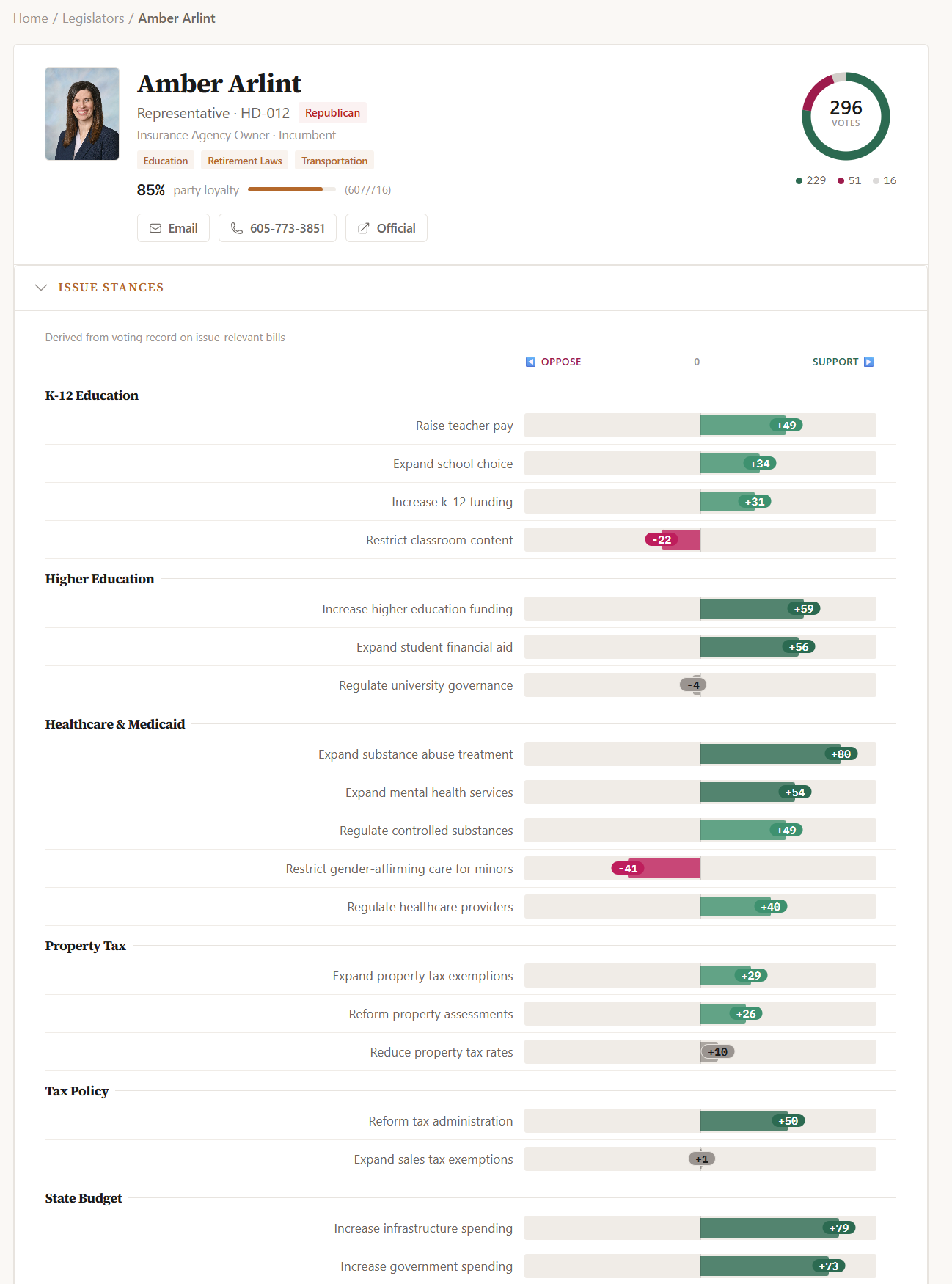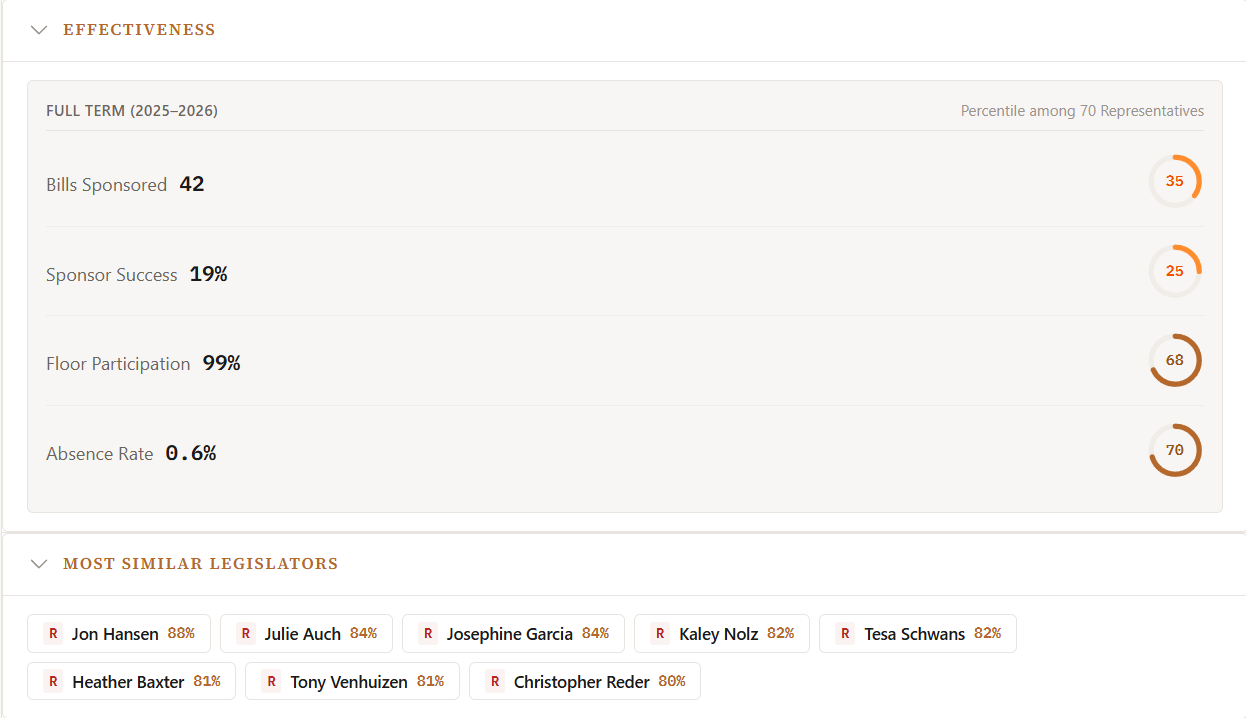 - Legislator issue stances: where each member falls on 35 policy categories, derived from their actual votes (not their press releases)